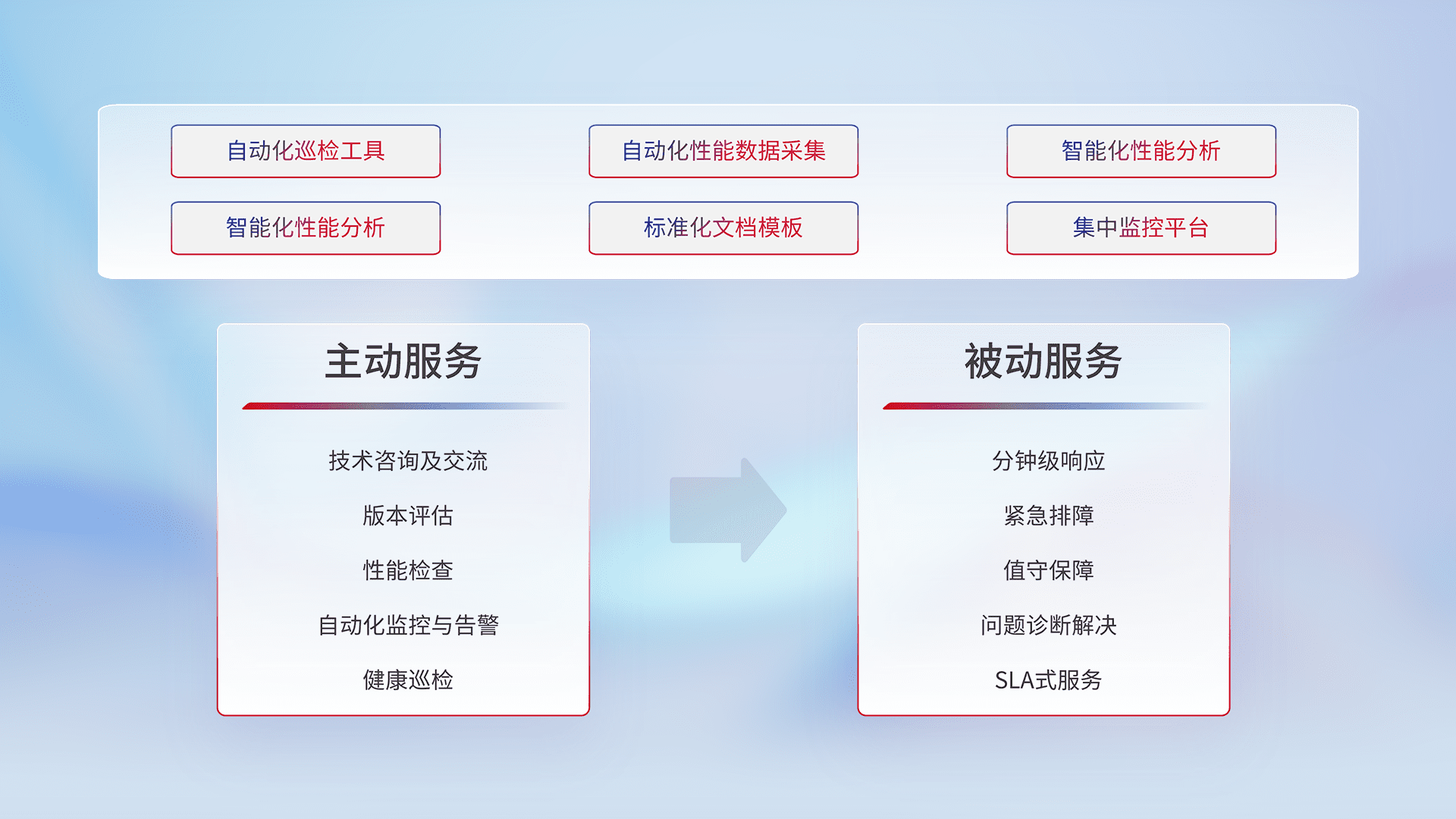 智能化工具和标准化文档,,保障服务质量,,提供主动服务(包含技术咨询、、版本评估、、性能检查、、、、自动化监控与告警、、、、健康巡检)和被动服务包含(分钟级响应、、、、紧急排障、、值守保障、、、问题诊断解决、、、、SLA服务)。。