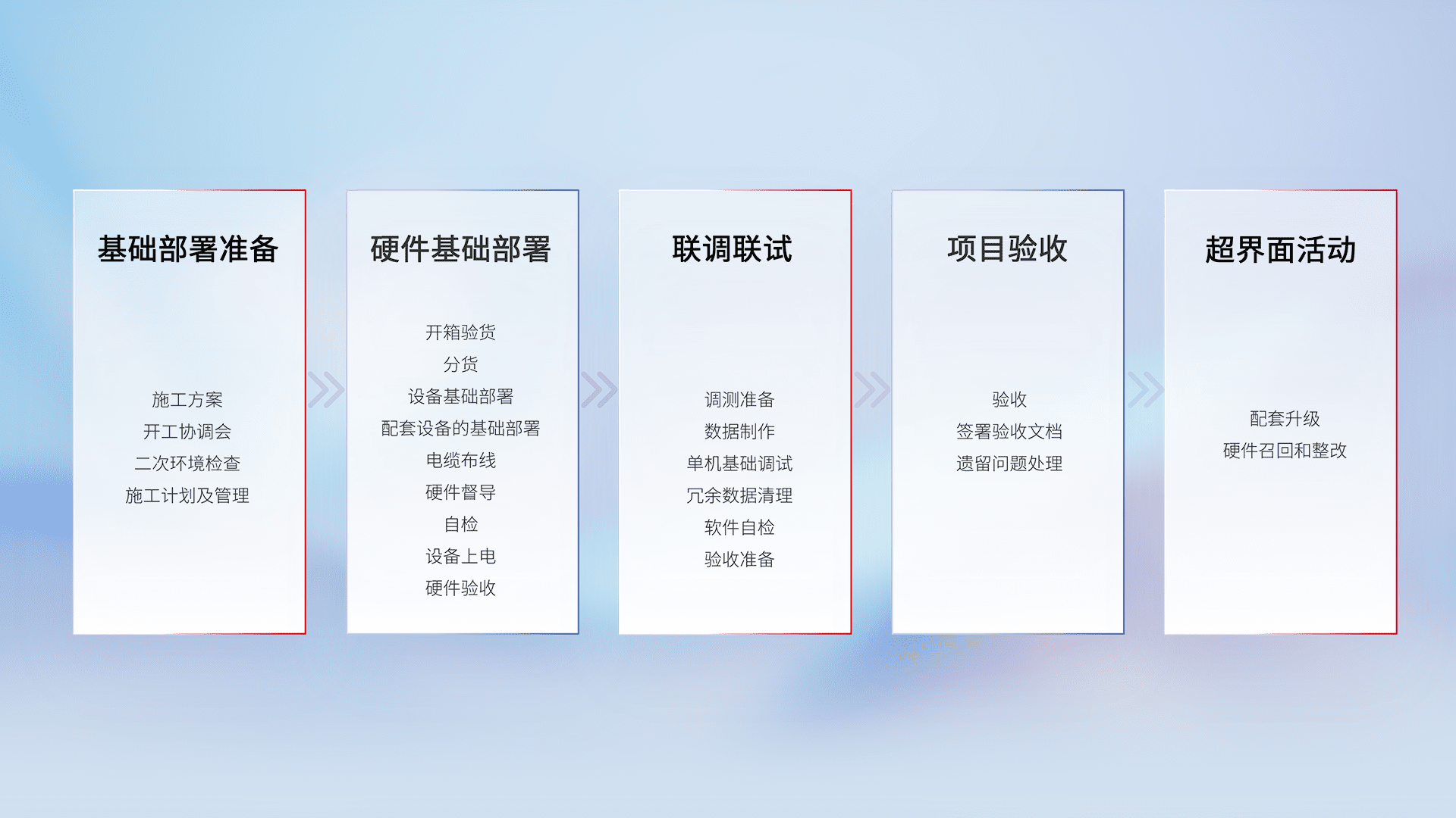 从基础部署准备、、硬件基础部署、、联调联试、、、、项目验收、、、越界面活动的全过程可追溯,,,保证施工质量和进度。。。